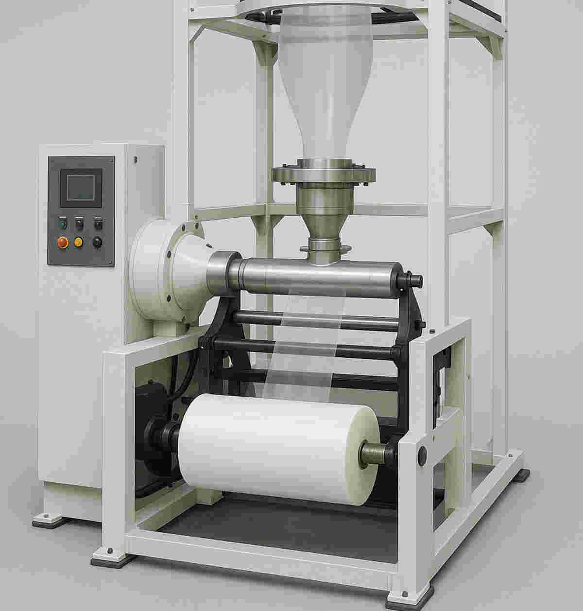 Die Integration von effizienten Kühl- und Steuerungssystemen ist unerlässlich für die Herstellung gleichmäßiger und qualitativ hochwertiger Folien. Moderne Blasfolienanlagen verfügen oft über fortschrittliche Kühlsysteme, die dafür sorgen, dass der Kühleffekt gleichmäßig über die gesamte Folienbreite verteilt wird. Das Steuerungssystem ermöglicht zudem die präzise Überwachung und Einstellung von Parametern wie Foliendicke und -breite, was für die Konsistenz und Qualität der Endprodukte entscheidend ist.
